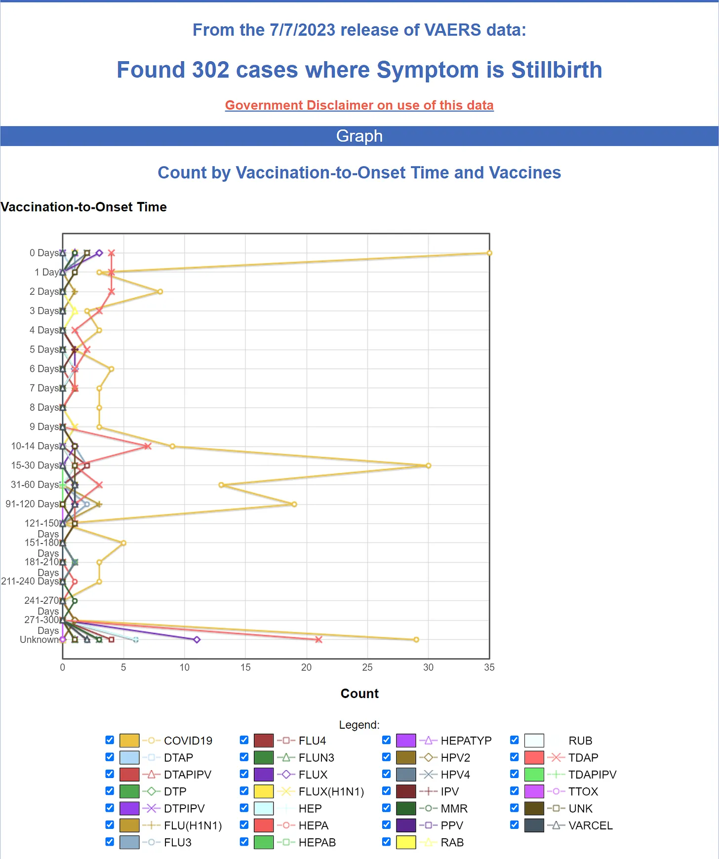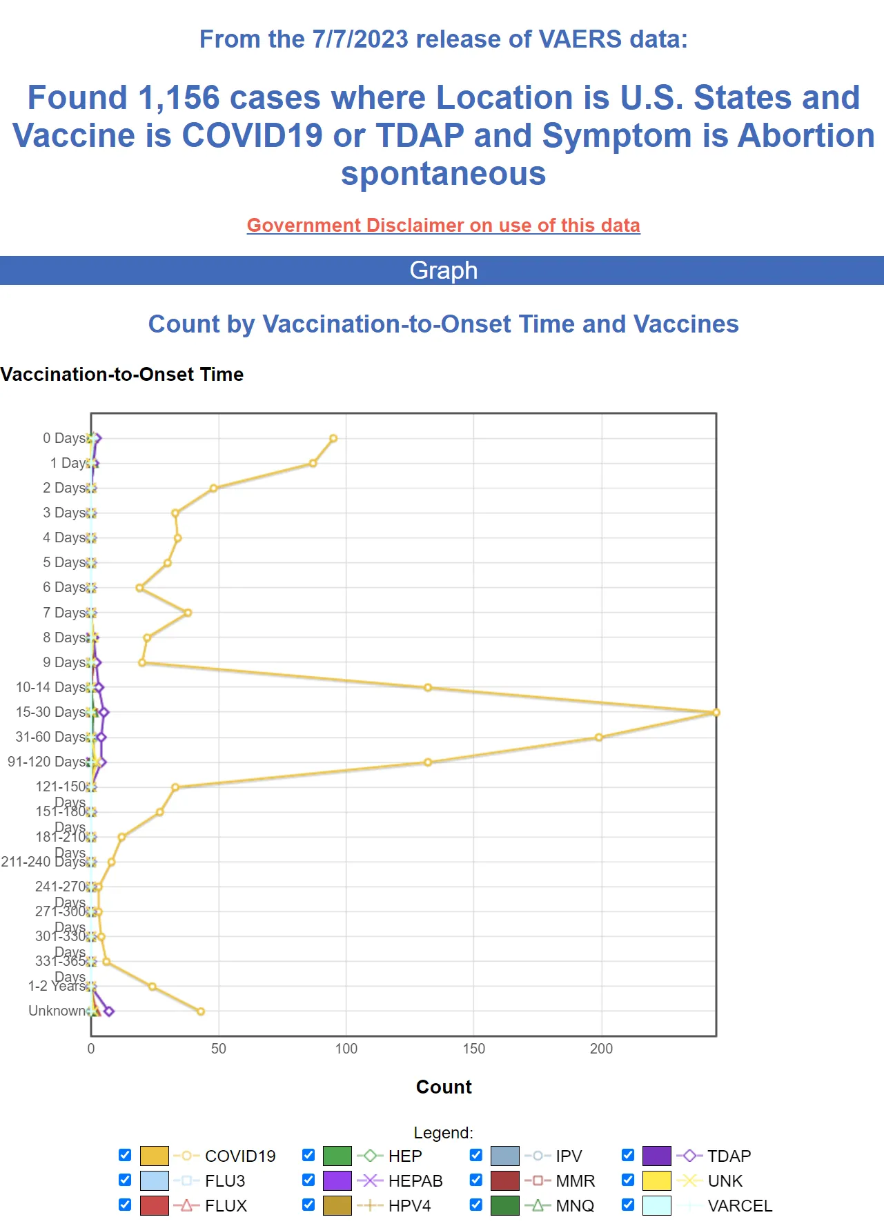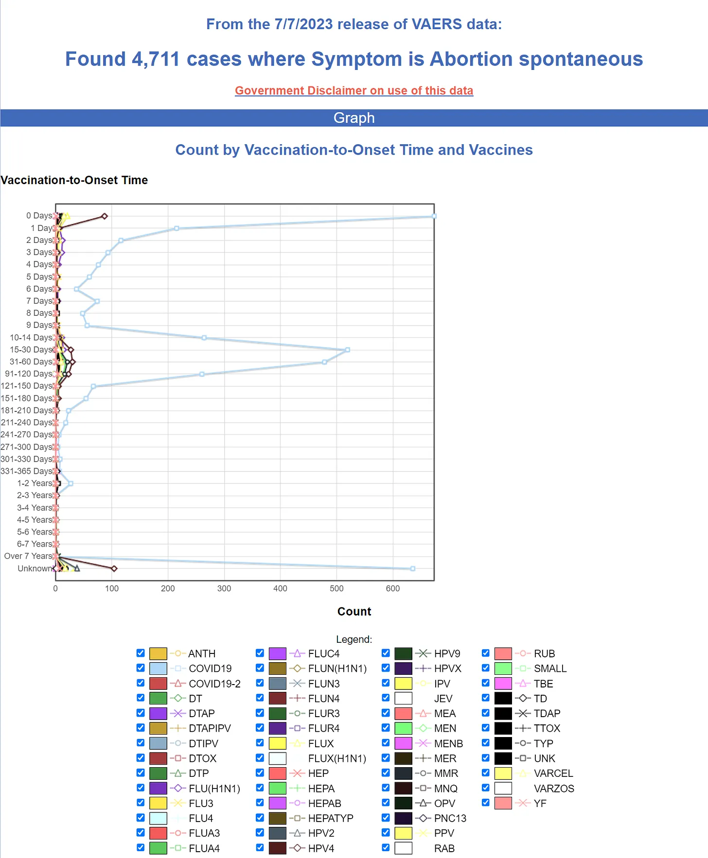 Aber die Tatsache, dass die gemeldeten Spontanaborte bei allen anderen Impfstoffen im Laufe der Zeit sehr niedrig sind, legt nahe, dass die VAERS-Meldungen nur dann erfolgen, wenn der Meldende einen Zusammenhang mit einem Impfstoff vermutet. Im Jahr 2019 zum Beispiel, als alle normal geimpft wurden, gab es nur 7 gemeldete Spontanaborte für alle Grippeimpfstoffe zusammen, und 5 der 7 hatten einen Beginn am Tag 0 und KEINEN Beginn am Tag 1.
