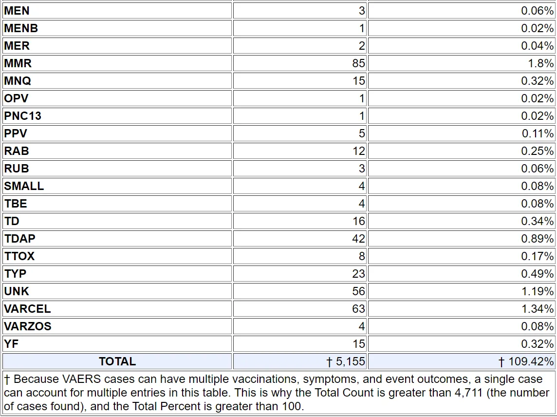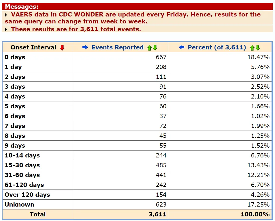 In der 33-jährigen Geschichte von VAERS gibt es 3.836 Berichte von insgesamt 4.711 Berichten für alle Impfstoffe zusammen, unabhängig vom Datum des Auftretens.