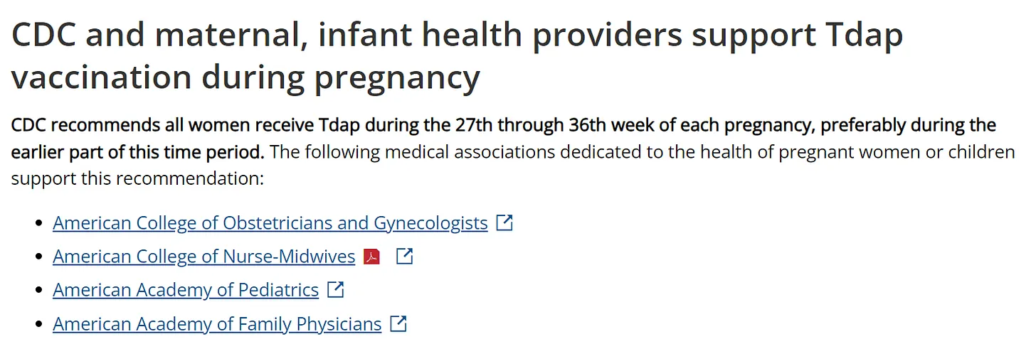 Seit 2012 und bis heute empfiehlt die CDC ALLEN Müttern eine Tdap-Impfung während jeder Schwangerschaft zwischen 27 und 36 Schwangerschaftswochen: