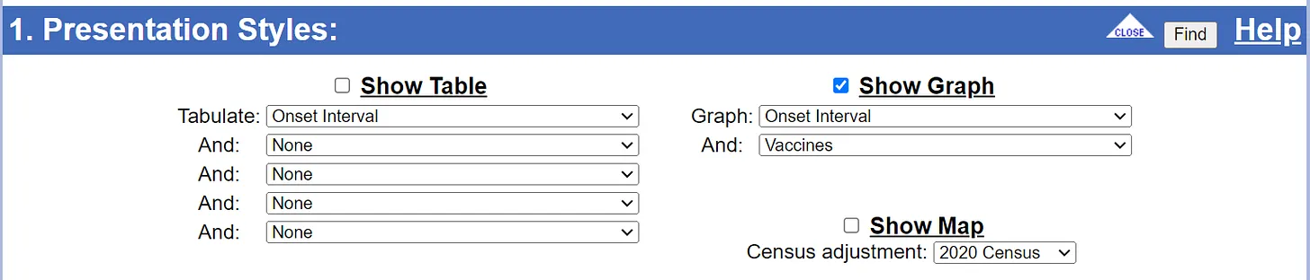 - A) Aktivieren Sie in Abschnitt 1 (Präsentationsstile) das Kontrollkästchen Grafik anzeigen und wählen Sie dann in den Dropdown-Menüs unten „Intervall des Beginns“ und „Impfstoffe“. HINWEIS: Wenn Sie einen Fehler machen und „Vaccine Type“ statt „Vaccines“ auswählen, wird das Formular nicht funktionieren.