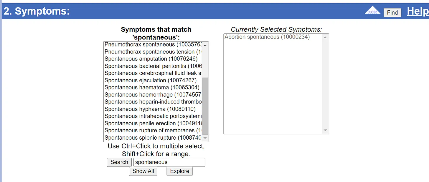 - B) Verwenden Sie in Abschnitt 2 (den Sie öffnen müssen) das Suchfeld und geben Sie „spontan“ ein, klicken Sie auf die Schaltfläche „Suchen“ links neben dem Suchfeld und wählen Sie dann, nachdem die Ergebnisse angezeigt wurden, einfach „Spontanabtreibung“.