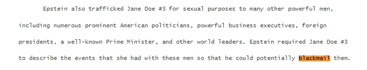 Ein Opfer sagte aus, dass Epstein es auf „amerikanische Politiker, mächtige Geschäftsleute, ausländische Präsidenten, einen bekannten Premierminister und andere führende Persönlichkeiten der Welt“ abgesehen habe, um sie „potenziell zu erpressen“.