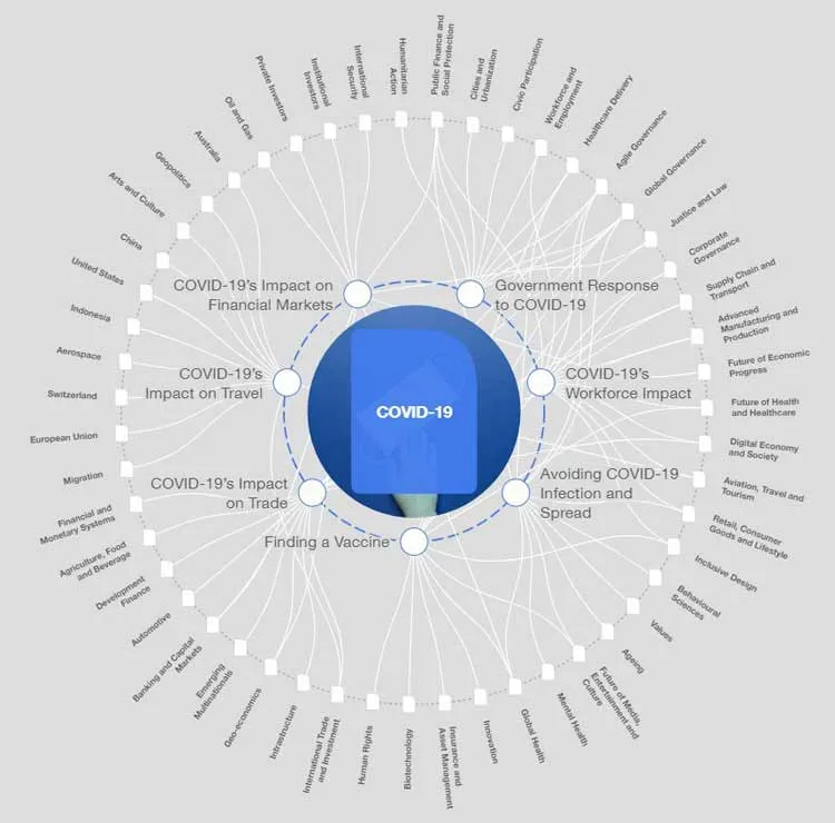 Wie könnte die Transformation durch The Great Reset aussehen? Wie von Corbett erwähnt, zeigt die folgende Abbildung, die vom Weltwirtschaftsforum erstellt und veröffentlicht wurde, die Auswirkungen der COVID-19-Pandemie auf verschiedene Lebensbereiche und wie die Reaktionen auf die Pandemie diese Bereiche verändern.