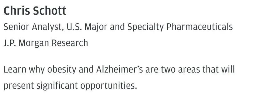 Die implizite Botschaft der gesamten Konferenz (und der Grund, warum Kim sie mir letztendlich schickte) war, dass wir im nächsten Jahr eine Menge Marketing für die Behandlung von Alzheimer und Fettleibigkeit sehen werden, da dies die neuen Wachstumssektoren für die Industrie sind.