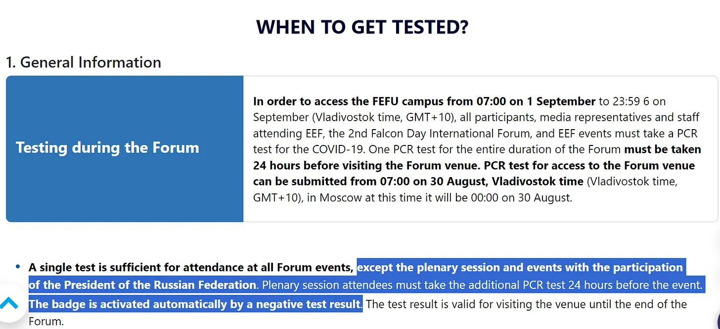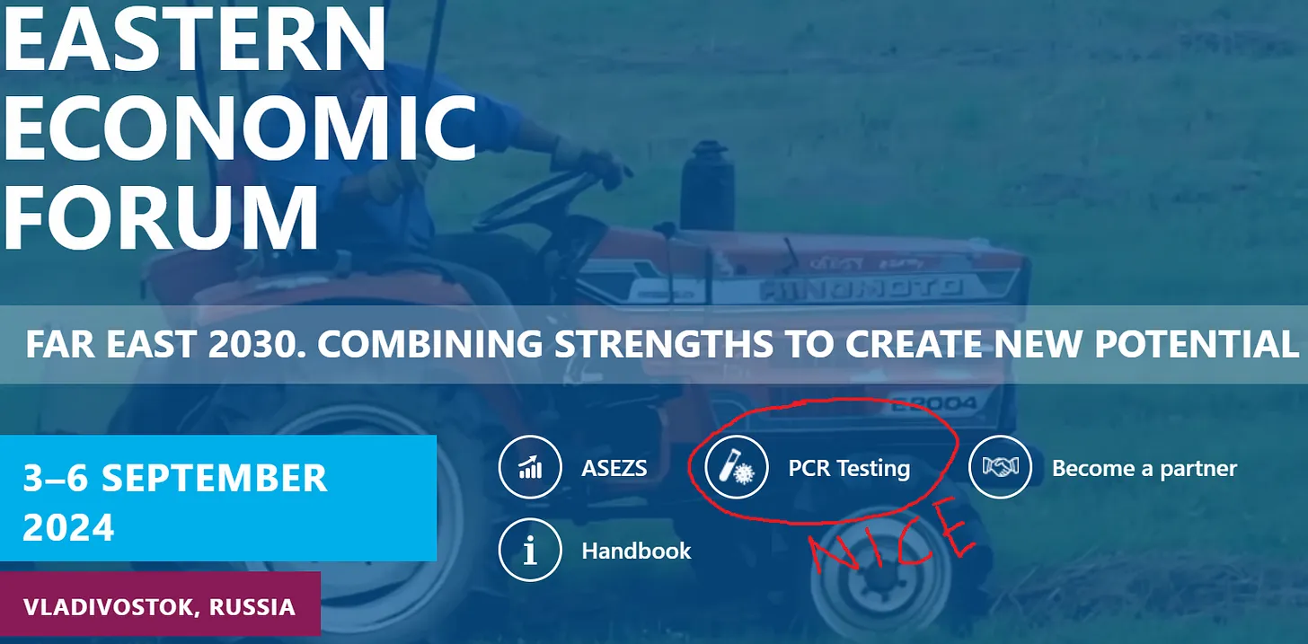 (Der zusätzliche PCR-Test für Putin könnte einigen Lesern ein wenig Unbehagen bereiten – aber keine Angst! Vor einiger Zeit schrieb Ihr Korrespondent einen vierteiligen Blog-Bericht, „Putin & COVID“, in dem er den streng geheimen Schattenkrieg des russischen Präsidenten gegen die WHO und Big Pharma detailliert beschreibt. Bitte lesen Sie diese wichtige Serie (Teil I, II, III, IV), um besser zu verstehen, dass dieser zusätzliche Eastern Economic PCR-Test Teil von Putins listigem Plan ist, Bill Gates in eine Strafkolonie in Sibirien zu schicken, bevor er vom russischen Verteidigungsministerium rekrutiert wird, um in einem Graben in der Ostukraine zu sitzen, bis er von einer Selbstmorddrohne getötet wird).