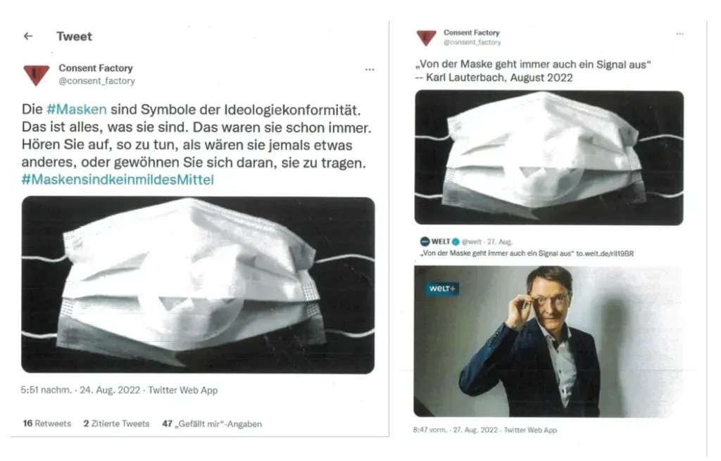 Für Leser, die mit meinem Fall nicht vertraut sind, habe ich getwittert, dass die Medizin-Masken, die jeder während der Jahre 2020-2022 tragen musste, „ideologische Konformitätssymbole“ seien. Mein Buch „Der Aufstieg des Neuen Normalen Reiches“ mit diesem Cover ist in Deutschland verboten.