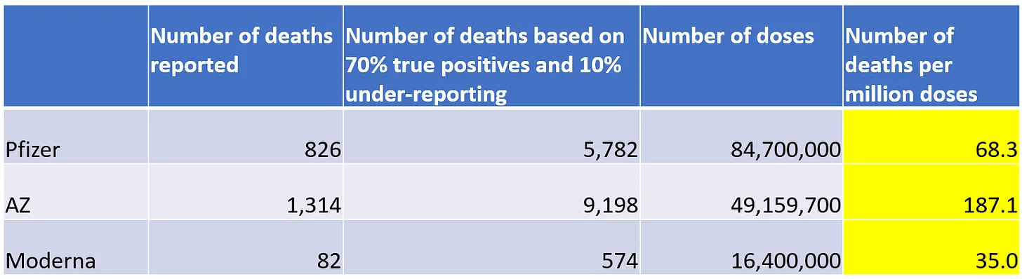 Ein Leser hat uns nun auf eine viel ältere Arbeit aus dem Jahr 1982 aufmerksam gemacht, die im BMJ veröffentlicht wurde und weitere wertvolle Einblicke in die Falsch-Positiv-Rate bei gemeldeten schwerwiegenden Impfstoff-Nebenwirkungen liefert. Obwohl die Stichprobe klein war (57 Meldungen an das Yellow-Card-System im Vereinigten Königreich), zeigt sie, dass 40 davon richtig positiv waren (77 %), während bei den verbleibenden 17 keine falsch positive Reaktion nachgewiesen werden konnte. In Ermangelung gegenteiliger Beweise kann also davon ausgegangen werden, dass mindestens 70 % der Meldungen von Todesfällen an das Yellow-Card- und das VAERS-System echt sind und dass die Rate der falsch positiven Meldungen unter 30 % liegt.