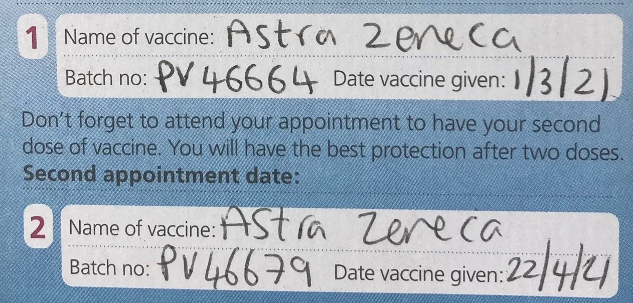 Ich weiß jedoch von einer äußerst schwerwiegenden und traumatischen Nebenwirkung, die kurz nach der zweiten Dosis des Impfstoffs von Astra Zeneca im April 2021 auftrat und dem Yellow-Card-System gemeldet wurde. Hier ist der Impfausweis mit den Chargennummern: