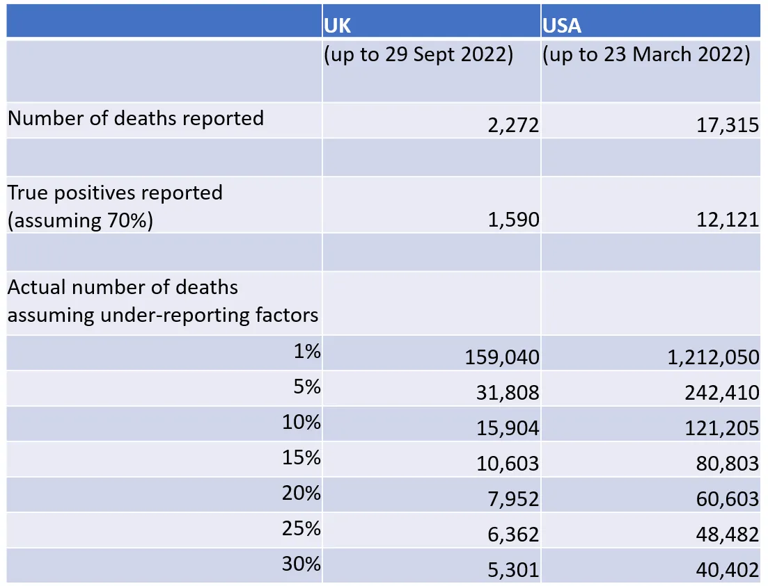 Bei einem Unterberichterstattungsfaktor von 10 % gehen wir daher von fast 16 000 Todesfällen im Vereinigten Königreich und über 120 000 Todesfällen in den USA aus. Diese Zahlen mögen zwar hoch erscheinen, sind aber nur ein winziger Teil aller seit Januar 2021 (als die Impfprogramme vollständig eingeführt wurden) registrierten Todesfälle. Im Vereinigten Königreich beispielsweise wurden zwischen Januar 2021 und Ende September 2022 insgesamt mehr als eine Million Todesfälle registriert, so dass 16 000 Todesfälle durch Kuhimpfung, was die überzähligen Todesfälle betrifft, kaum auffallen würden (weniger als 1,6 %).
