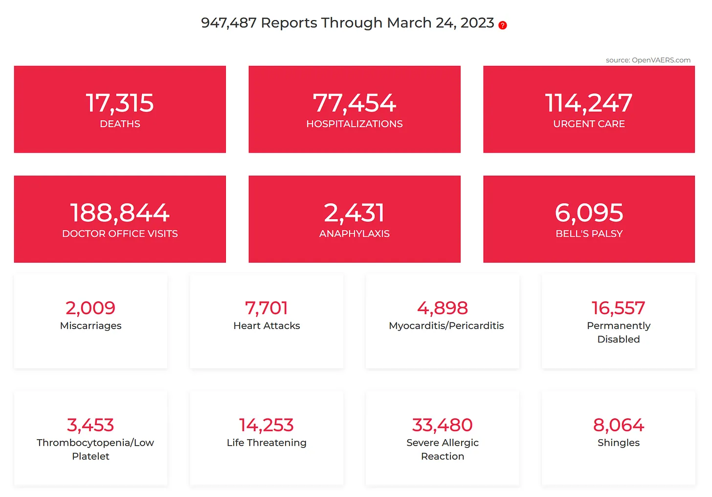 - ca. 120.000 Todesfälle in den USA, die direkt durch die Covid-Impfstoffe verursacht wurden (zwischen Dez. 2020 und 23. März 2023) und 16.000 im Vereinigten Königreich (zwischen Dez. 2020 und 29. September 2022).