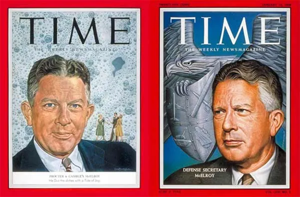 Hier sind zwei Titelseiten des Time Magazine: Das eine zeigt Neil McElroy von Proctor & Gamble, das andere Neil McElroy, den Verteidigungsminister.
