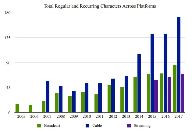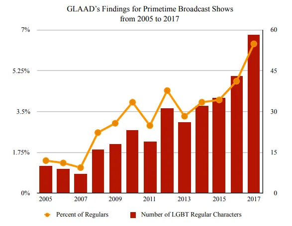 Diese Diagramme zeigen zum Beispiel die Anzahl der wiederkehrenden LGBT-Figuren in Fernsehsendungen während des betreffenden Zeitraums. Es ist eine Explosion zu erkennen, die um die Zeit der Occupy-Wallstreet-Bewegung von 2011 herum stattfand, die die Eliten bis ins Mark erschütterte. Sie brauchten einen Wechsel der Erzählweise, und zwar schnell – und sie bekamen ihn.