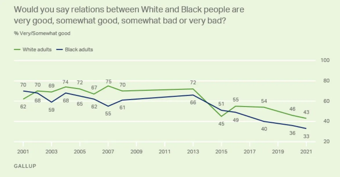 Im Jahr 2011 hielten nur 35 % der weißen Liberalen Rassismus in den Vereinigten Staaten für “ein großes Problem”, wie eine nationale Umfrage ergab. Bis 2015 stieg diese Zahl auf 61 % und 2017 sogar auf 77 % an. – Quelle