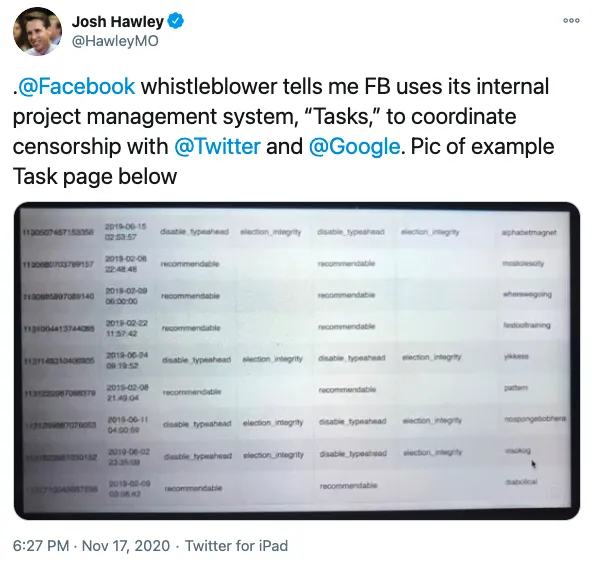 Wie oben zu sehen ist, haben Facebook, Google und Twitter die Namen “problematischer” Konten untereinander verteilt, um eine koordinierte Deplattformierung zu erreichen.