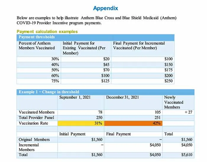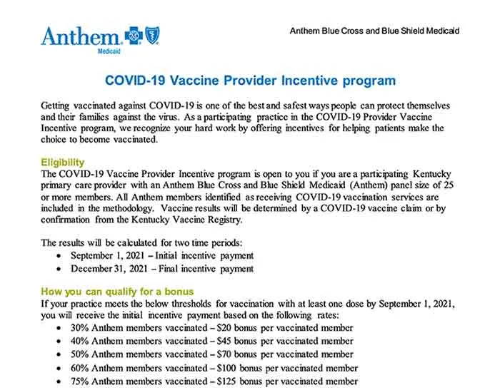 - Im Rahmen des COVID-19-Impfstoff-Anbieter-Incentive-Programms von Anthem erhalten Impfstoffanbieter eine finanzielle Entschädigung dafür, dass sie Impfungen in die Arme der Patienten geben